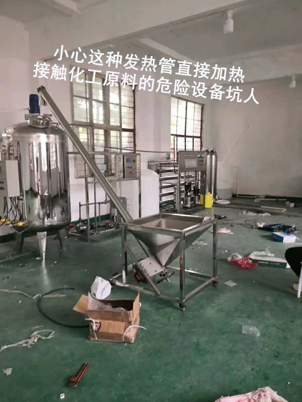 廣大客戶朋友應(yīng)當(dāng)小心上圖這種洗潔精設(shè)備內(nèi)部直接加熱的薄皮偽劣設(shè)備,這種設(shè)備內(nèi)部安裝的直接接觸化工原料的發(fā)熱管,容易因?yàn)榛ぴ细g導(dǎo)電引發(fā)人身安全事故。這類騙子最大特點(diǎn),一沒有環(huán)評(píng)資質(zhì),二是設(shè)備類似薄皮棺材低價(jià)銷售。之所以這類騙子有市場(chǎng),是因?yàn)橛写蟛糠钟脩糌潏D便宜被一葉障目。