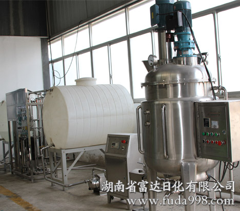 3)富達(dá)日化洗潔精設(shè)備特點(diǎn):傳統(tǒng)洗潔精生產(chǎn)設(shè)備,就是安裝一個(gè)攪拌機(jī)裝置對(duì)原料攪拌,因攪拌不均勻產(chǎn)品乳化不夠好,導(dǎo)致成品上層濃度太小。故只能投入更多的原料,即增加了成本。因乳化不夠好,一段時(shí)間后產(chǎn)品容易分層,容易變質(zhì)。富達(dá)日化洗潔精生產(chǎn)設(shè)備,在機(jī)器上部安裝高速剪切機(jī)和攪拌機(jī),兩臺(tái)裝置高速旋轉(zhuǎn)(3000轉(zhuǎn)/分),讓原料能夠充分的攪拌和乳化,達(dá)到濃度統(tǒng)一,產(chǎn)品不容易分層,節(jié)省了成本的同時(shí)也保證了質(zhì)量;下部安裝的是乳化裝置,把難以溶解的原料循環(huán)徹底乳化,使保質(zhì)期延長(zhǎng);